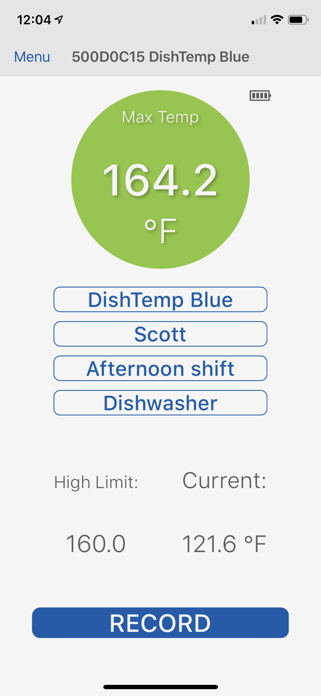 - Wait 3-4 minutes for DishTemp Blue to stabilize, then read the CURRENT TEMP.
